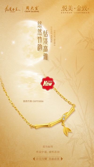 竹子与梅、兰、菊一道并称为“四君子”,是中国人感物喻志的象征,同时也是咏物诗以及文人画中广为流传的题材之一。诗神苏轼曾言道:“宁可食无肉,不可居无竹”,由此可见历代文人喜好以竹自喻,以竹言志,以竹修心,竹子在中国传统文化中的重要地位可见一斑。周大生以竹为意,化而为形,以黄金镶钻工艺倾心打造“悠然竹韵”,生动展现一竹一叶的雅韵美。古法金的金光熠熠为常以苍翠欲滴形象示人的竹子带来别样风情,钻石的点缀更是为“悠然竹韵”添上神来之笔,以金光示人,更以璀璨耀人,前调优雅,后调亮眼,将超然淡雅的竹子装扮上身,彰显胸有成竹,柔韧有节。竹子四季常青且高大挺拔,象征着青春永驻,节节高升的美好寓意。周大生以“悠然竹韵”送上美好祝福,愿每位佳人能芳华常在,美丽依然,事业成就节节高升,欣欣向荣。